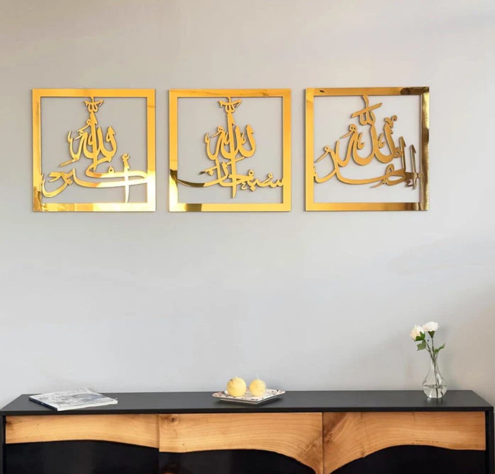 Core of Faith: 🕌 Embrace the serenity and gratitude of faith with this trio—"Subhanallah" (Glory be to Allah), "Alhamdulillah" (All praise is due to Allah), and "AllahuAkbar" (Allah is the Greatest)—each piece crafted in elegant Islamic calligraphy.